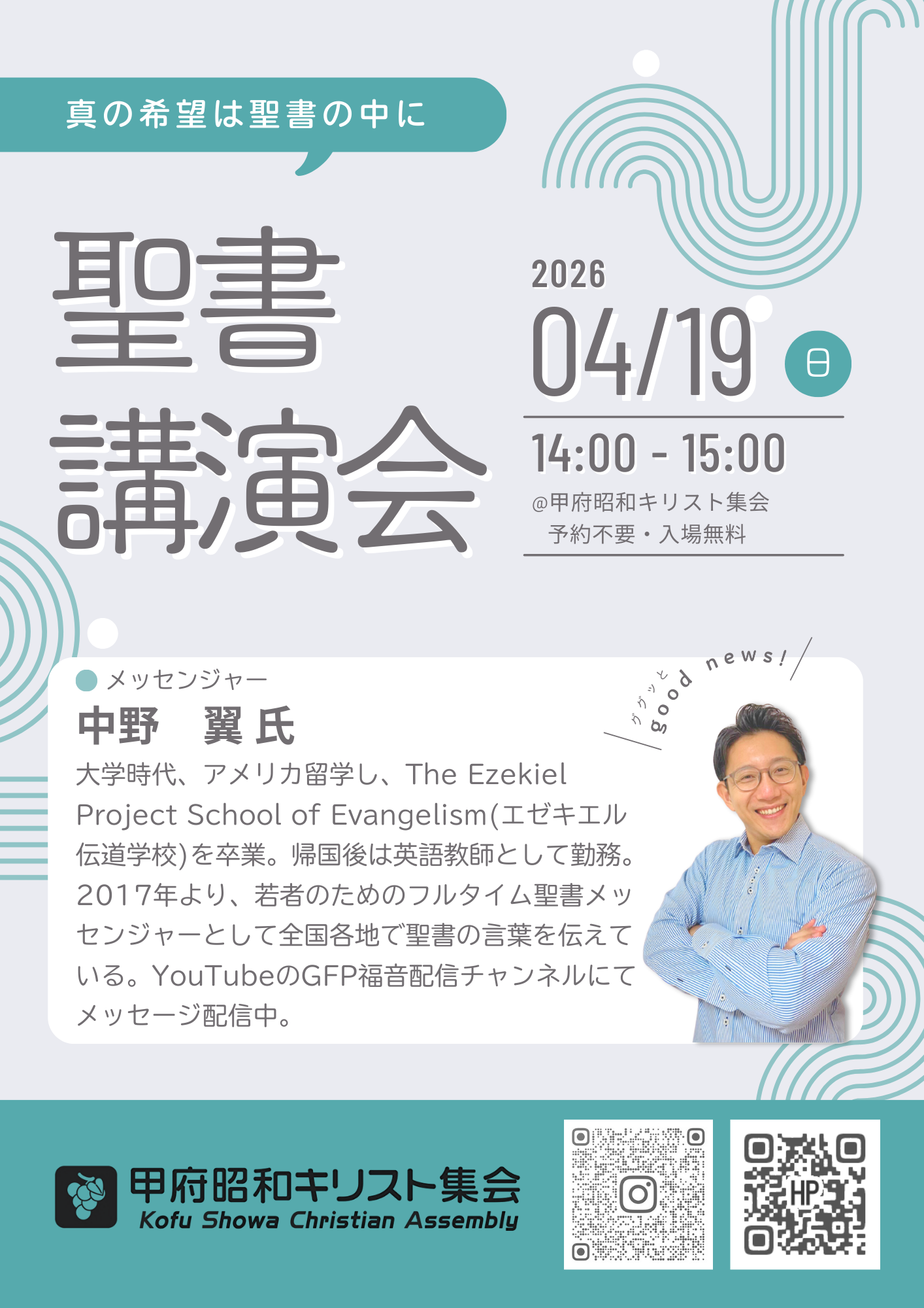 どなたでもご参加いただけます!!お問い合わせは電話 0552 44 3901 または メールにて問い合わせイベント案内はインスタグラムでも公開しています!聖書講演会2026/2/28(土)ー3/1(日) 午後2時~4時メッセンジャー 高原 剛一郎 氏 聖書講演会2026/4/19(日) 午後2時~4時メッセンジャー 中野 翼 氏